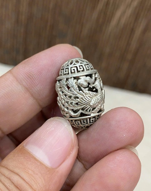 Hạt châu rỗng chạm hình Phượng hoàng, hợp kim bạc tây tạng độc đẹp