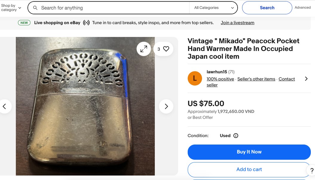 Bật lửa sưởi ấm bỏ túi, hàng vintage Nhật, vỏ Inox sáng bóng còn mới đẹp